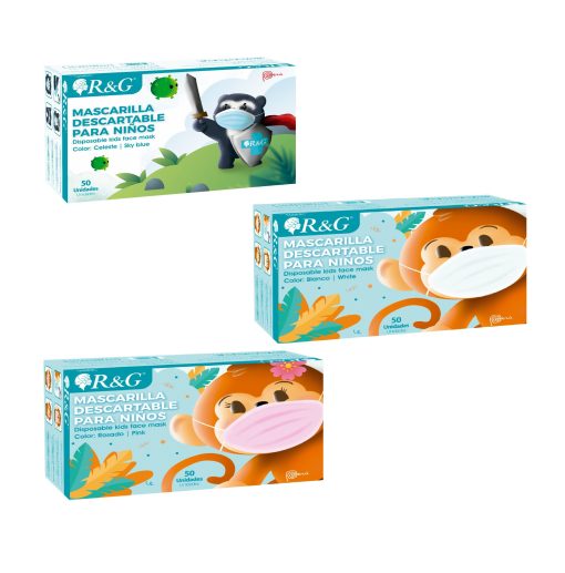 Disposable flat mask for children, with 3 folds, made with three layers of non-woven polypropylene fabric, the middle layer is made up of a high-performance filter. With elastic fastening on both sides and ergonomic nose molding, located on the upper edge of the mask, protected so as not to injure the skin or cause discomfort and intended to minimize infectious contacts